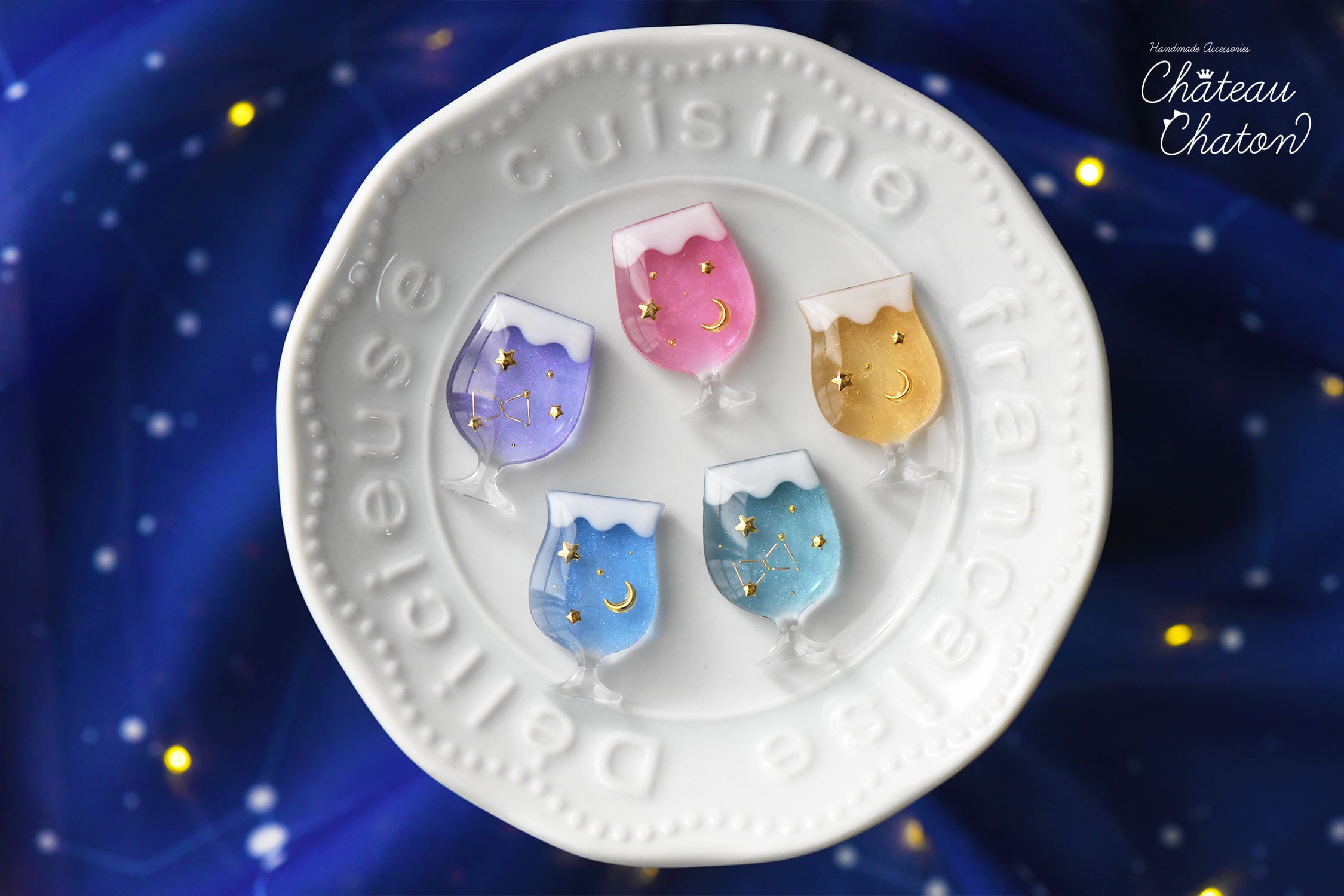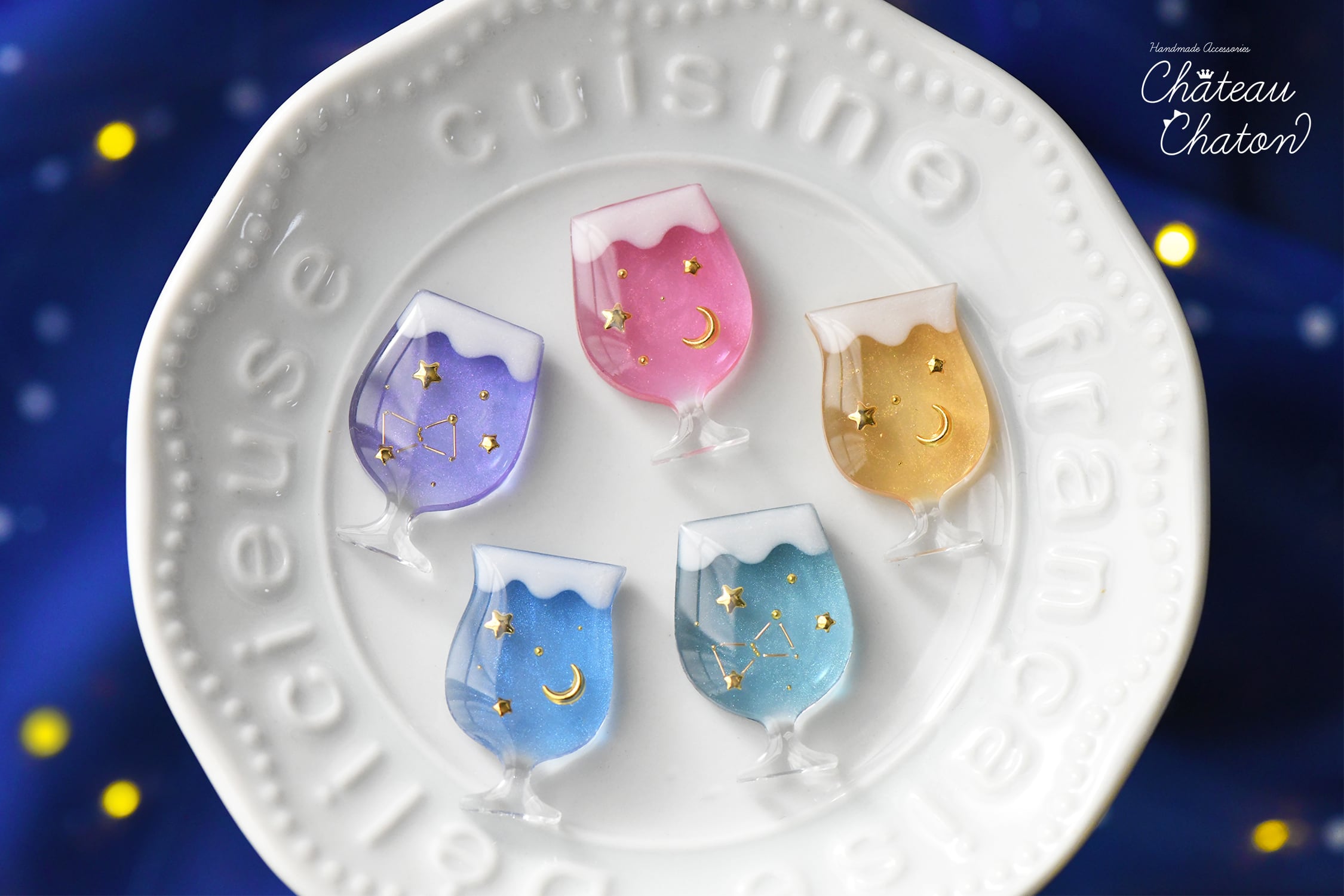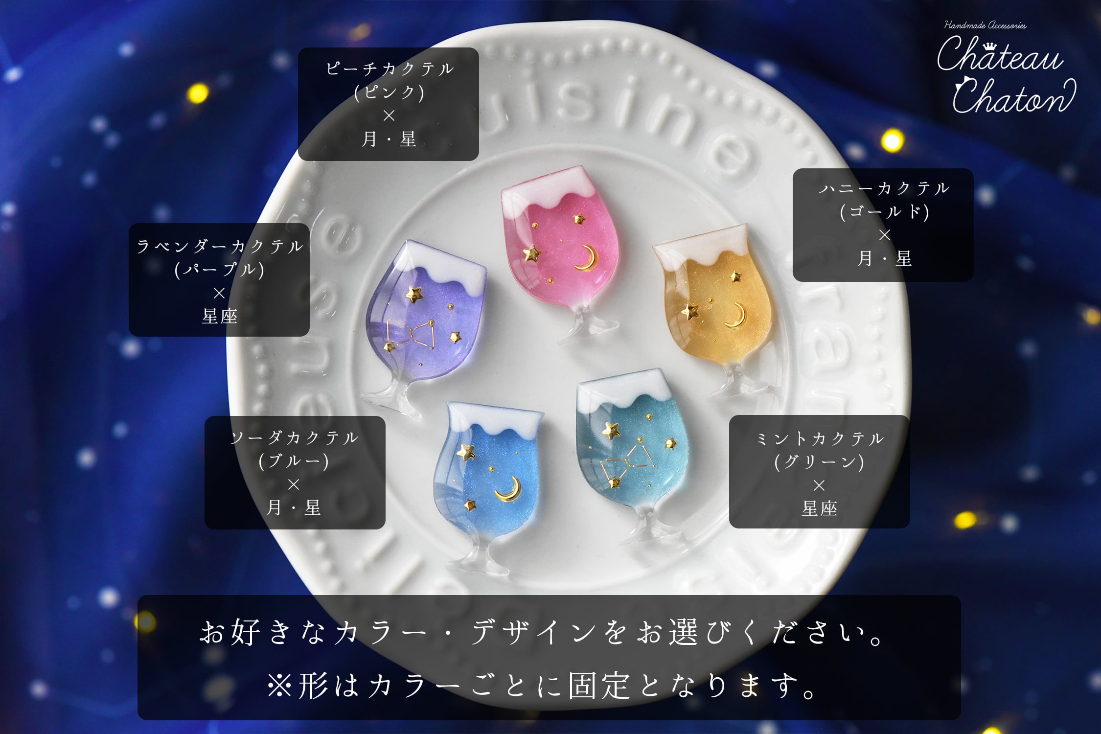 ソーダグラスモールドの透明感を活かし、光を受けるたびにしゅわっと輝く夜空のドリンクのような仕上がりにしました。